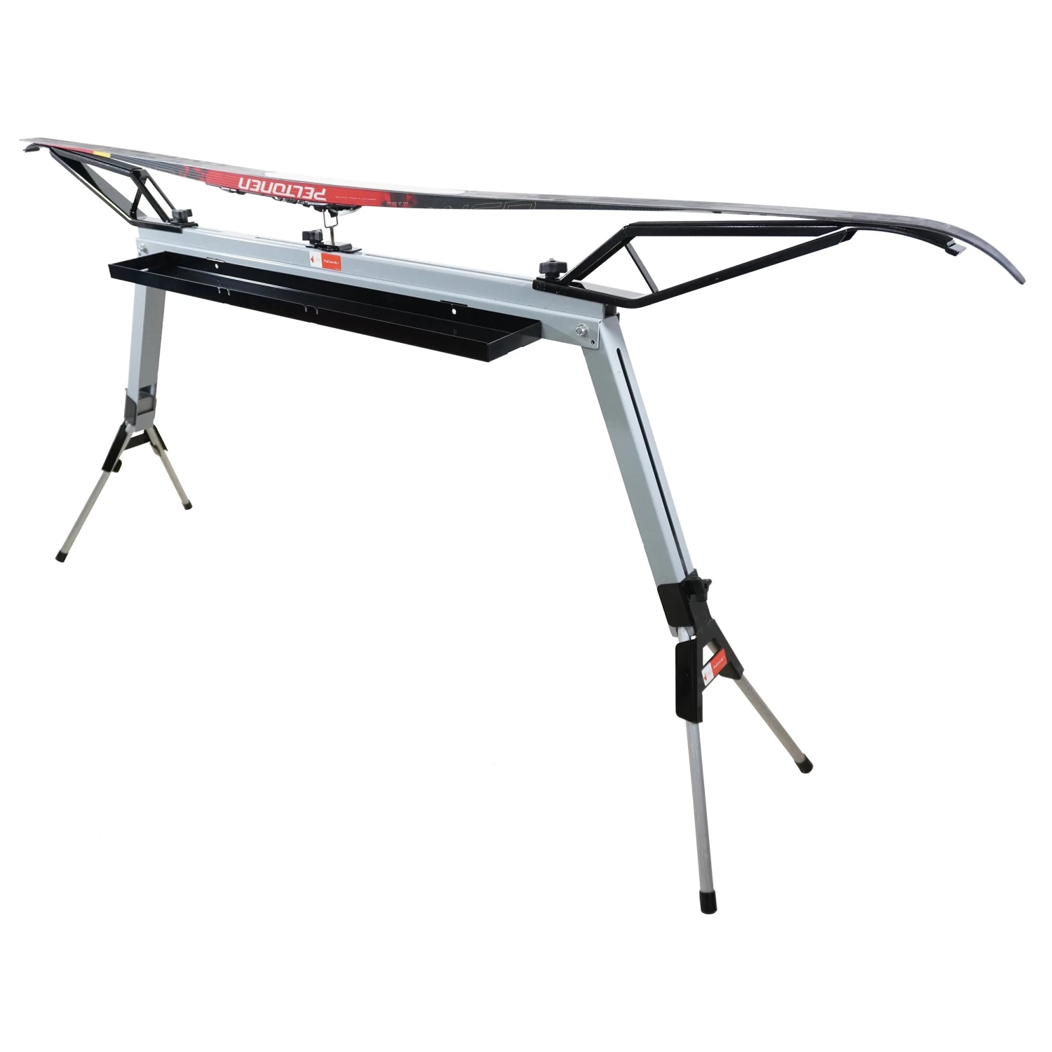 The ProForm AL-1 Wax Bench FULL SET is a top-of-the-line Nordic ski waxing and maintenance workstation. It is manufactured and assembled in Canada, ensuring high quality and durability. The FULL SET comprises three `segments`: 1) the Form, 2) the Legs, and 3) the Tray. Each segment can be purchased separately, or all three can be bought in this `full set.` The `form` is the main segment. Its adjustable wings and binding bar soundly hold Nordic skis in place. The form can be attached to existing work benches with your clamps, bolts, or construction screws. Or it can be mounted to the “legs” segment. The wings of the form have rubberized tops to prevent skis from sliding. The adjustable wings accommodate Nordic skis of all sizes, from junior to adult. The form is compatible with SNS and NNN bindings, allowing for easy clipping onto the form`s binding bar. The Legs segment is a mobile, foldable stand for the form and tray(s). It can be folded down to fit in a small ski bag – ideal for taking on the road – or used in a garage and folded away for the summer. The tray provides table space for your wax and tools. Up to two trays with the tongue and slot system can be mounted to the same legs.