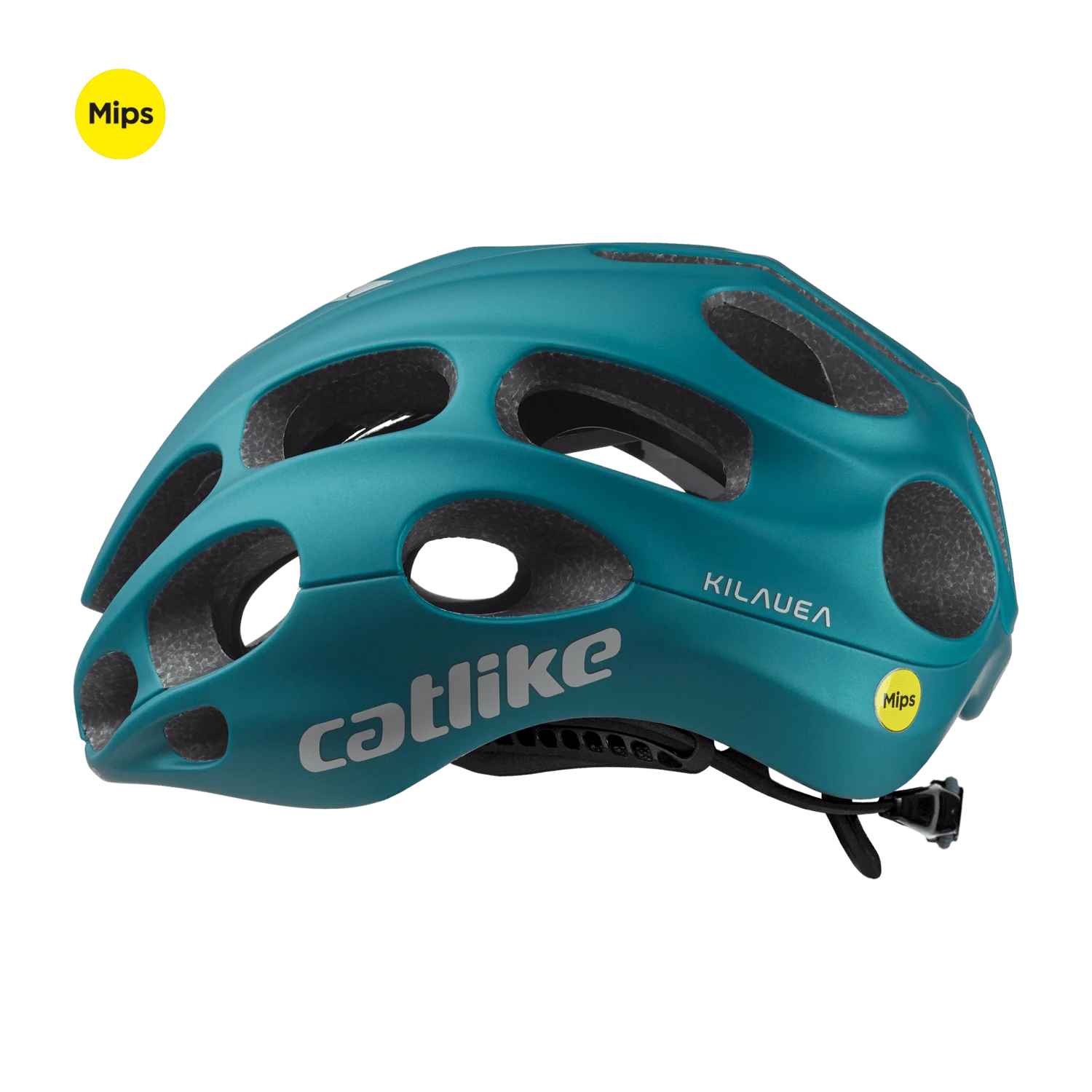 The Kilauea is a great answer for those who want a more aerodynamic road helmet, without losing the Catlike ventilation. The Kilauea uses only 24 larger vents (10 front, 14 rear) to channel air around your head. The design pulls more air from the rear, allowing from better aero results. This helmet is was developed with a comfortable overall fit, as well as the MIPS Evolve system* for increased safety rotational impact protection. This helmet is superlight, weighing in at only 240g for a medium, but does not lack in structural strength using a Aramid Roll Cage. This feature acts as a “skeleton“ to dissipate the energy of an impact evenly throughout the helmet, as well as hold it together in a crash. This top performance helmet will make you fast, as well as keep you cool! *The Black and White models will not be available until MIPS is available in them due to Catlike going through the process of updating their lineup.