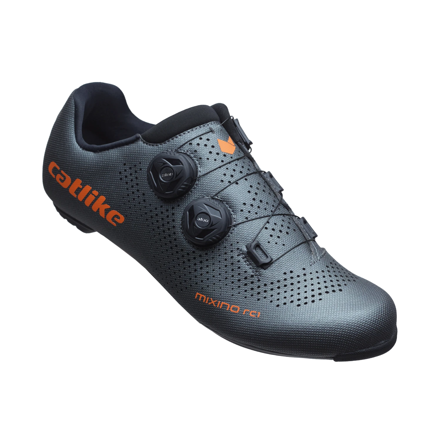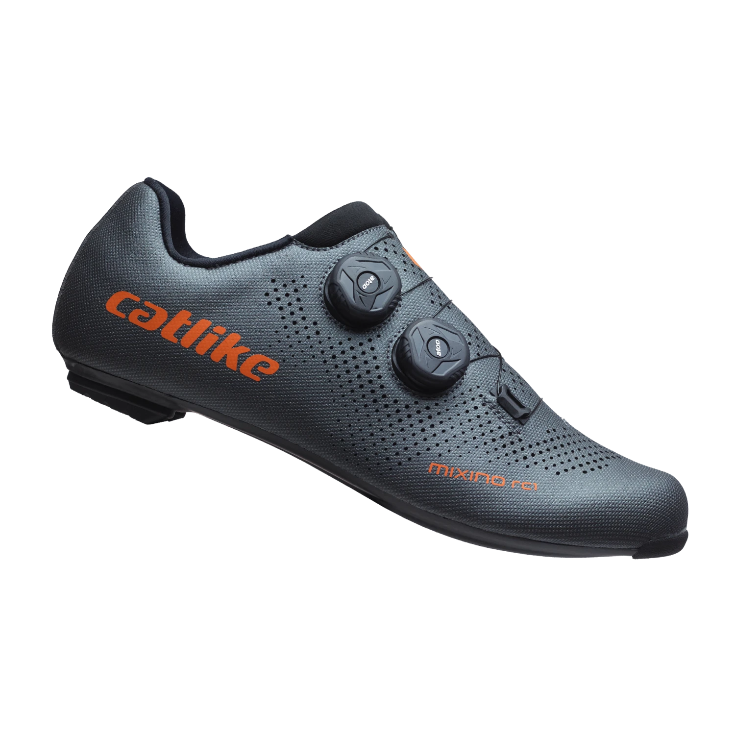 The Mixino RC1 shoe is Catlike`s top racing shoe! This version is for the road, meaning the sole is ready for a 3 bolt road cleat. A breathable construction using lightweight materials, arch support, and a stiff 3K Carbon sole; this shoe is for those top performing cyclists who want a top performing shoe. The engineering put into this shoe ensures that all watts transfer through your cranks with every pedal stroke. Dual micro-adjustable dials means that you perfect your fit. This shoe weighs in at 265g per pair at size 43.