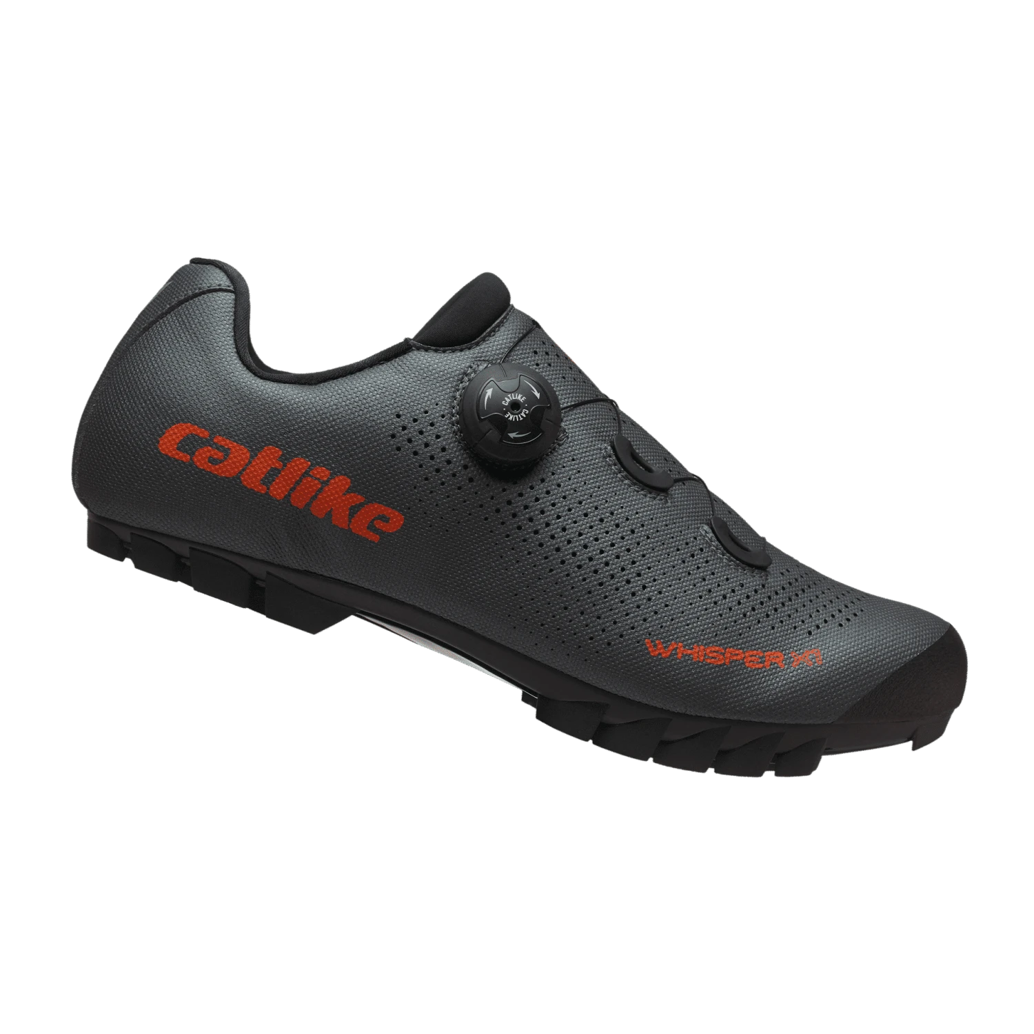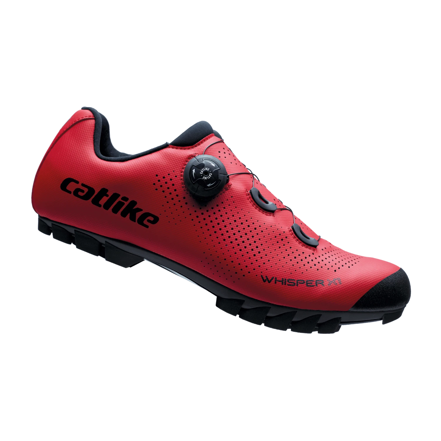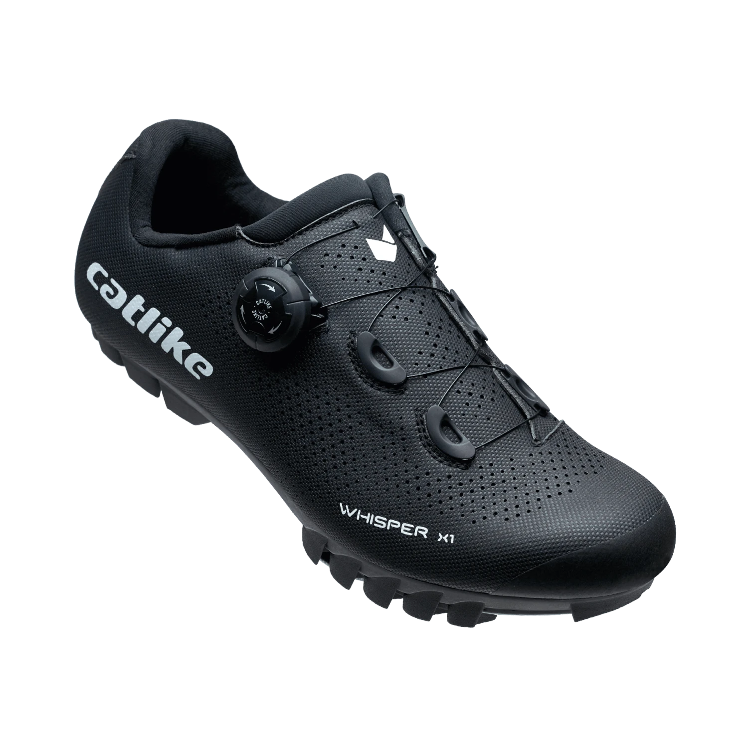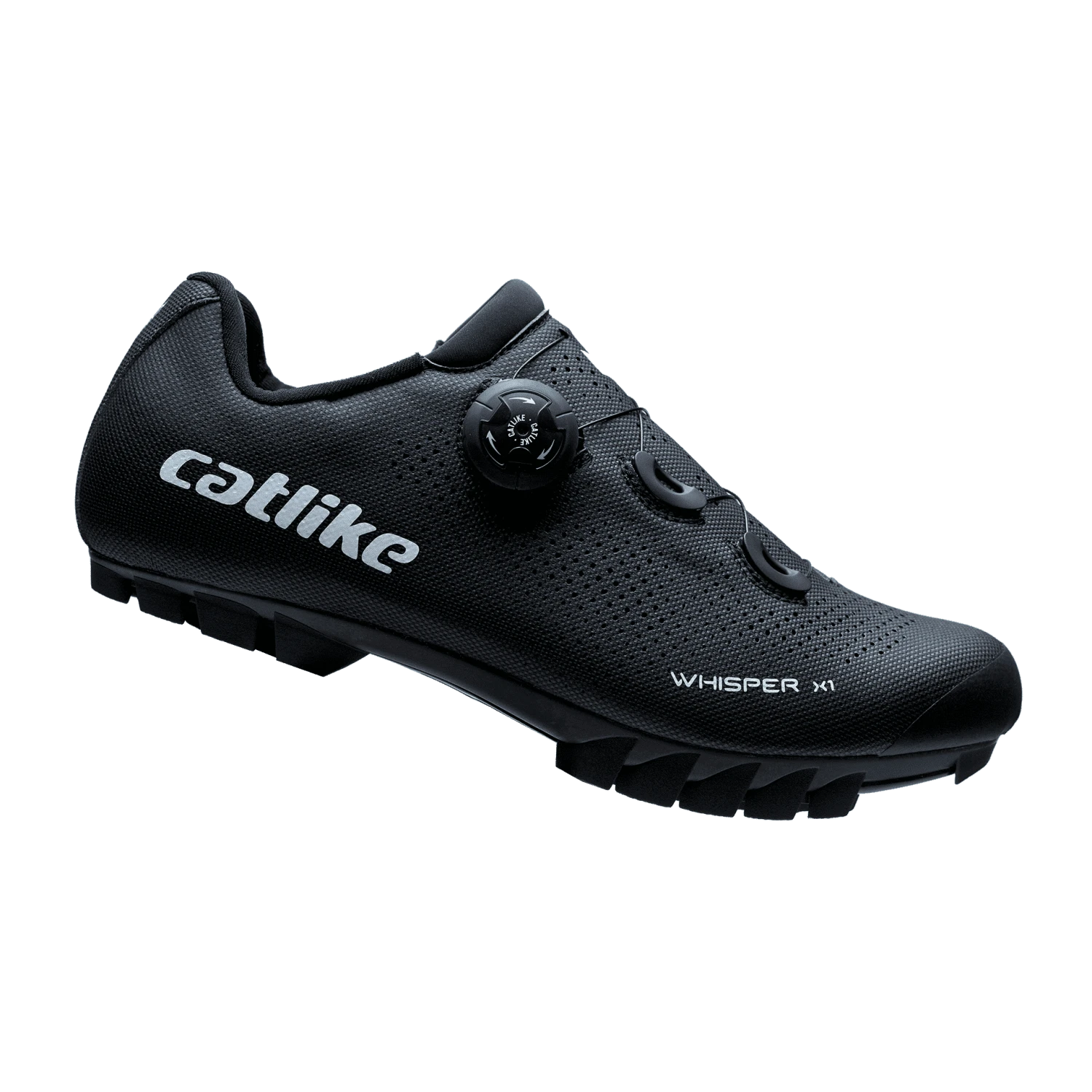 The Whisper X1 shoe is Catlike`s midrange shoe! This version is for the trail, meaning the sole is ready for a 2 bolt MTB cleat. A breathable construction using lightweight materials, neutral arch that adapts to your foot, and a stiff reinforced composite sole; this shoe is for those racing cyclists who want a top tier shoe. The Whisper X1 model comes with extra front protection for safety from debris, and gripping treads for muddy conditions. The engineering put into this shoe ensures that your energy is maximized with every pedal stroke. A micro-adjustable dial means that you perfect your fit. This shoe weighs in at 335g per pair at size 43.