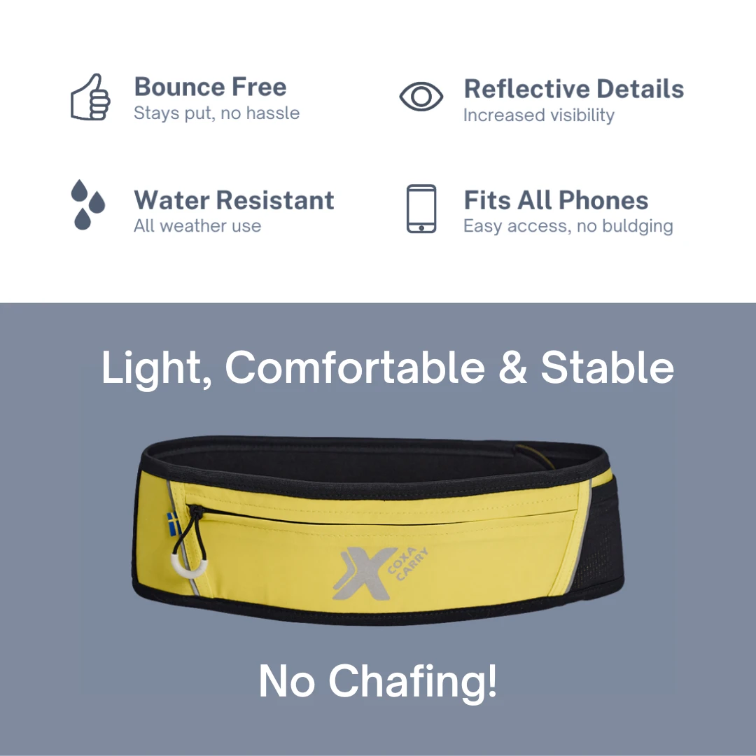 The WB1 is a small, lightweight belt for carrying just the essentials. It does not come with any water resevoir to keep your activity light. It is designed with the standard Coxa ergonomics with an adjustable velcro waistband and anti-bounce design. It is light, breathable, and reflective, designed with endurance athletes in mind!