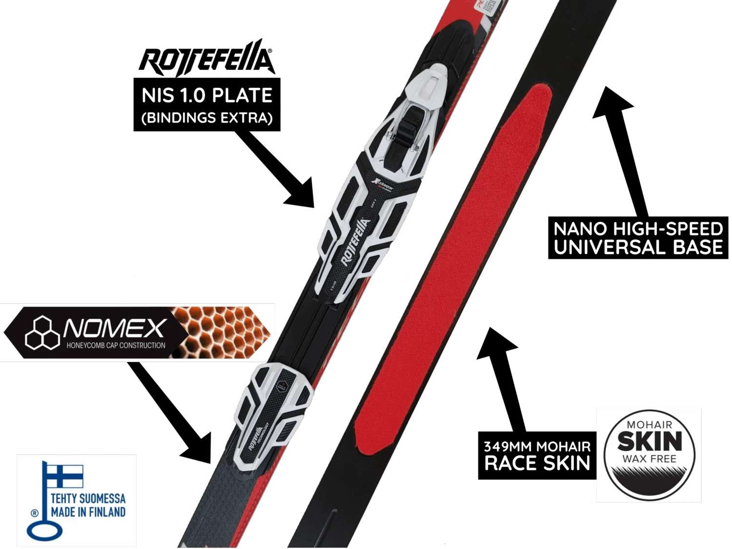 Infra X Skin is a kick-wax-free ski with a full spectrum of racing ski features. It is built with the same top elements as other Peltonen WCR racing skis, like the NOMEX core and Nano High-Speed base material. These skis are B-grade quality from the factory, meaning they either have minor cosmetic defects or the flexes of each ski do not match as closely as we`d like. These skis have old graphical designs and are, therefore, on clearance while supplies last.