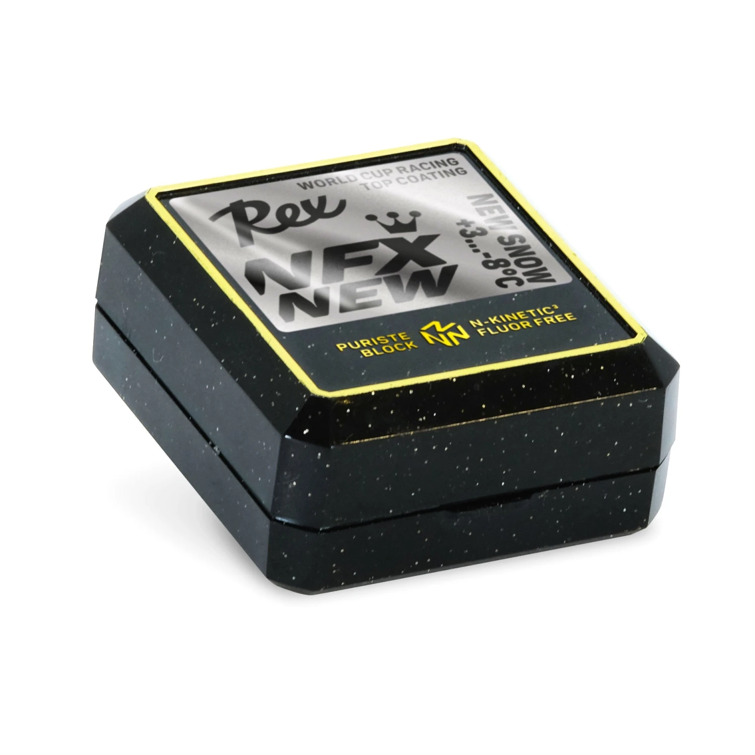 Next generation of Rex fluoro-free race glide wax, NFX is a step up from the NF-Series. The NFX-Line of powder use a handful of new Rex technologies to speed up fluoro-free waxes such as micronized Power Polymers, and N-Kinetic Level 3 (increased glide properties and dirt repellence). The NFX Blocks are compressed powder blocks for an easy-to-apply top coat. Simply rub on base, heat in with iron, and finish with cork, felt, or nylon. The NFX New Snow is for is for fresh snow conditions between 3C and -8C. Best used over top of NF21 Block or Liquid waxes.
