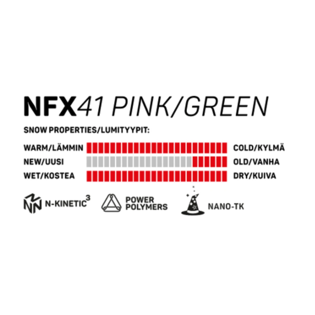 Next generation of Rex fluoro-free race glide wax, NFX is a step up from the NF-Series. The NFX-Line of powder use a handful of new Rex technologies to speed up fluoro-free waxes such as micronized Power Polymers, and N-Kinetic Level 3 (increased glide properties and dirt repellence). NFX41 is the very popular wax design for slushy wet snow, but also for cold, squeaky snow. It has a universal range of 10°C and -20°C. The Pink/Green UHW mix is great for anything, but really shines in very transformed snow!