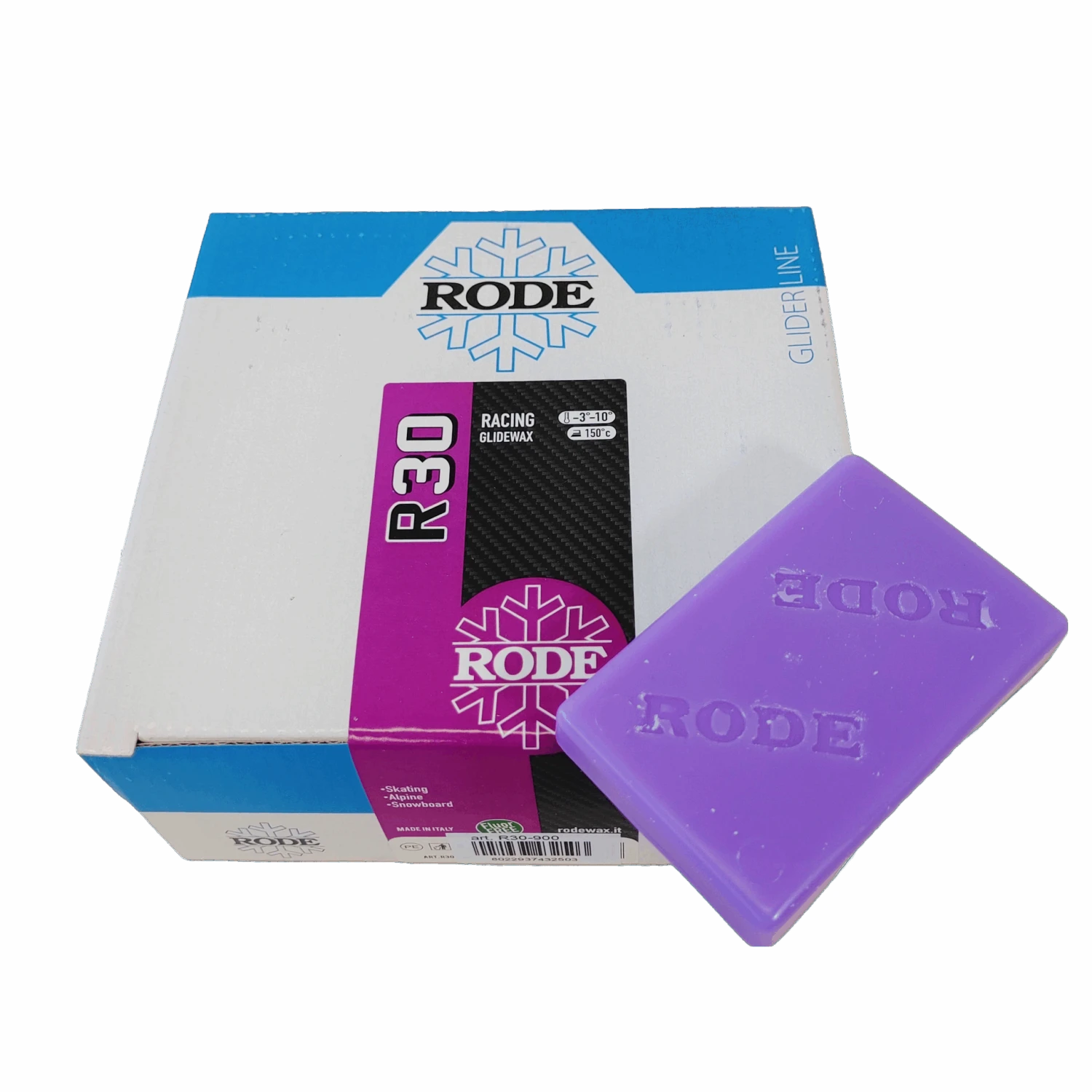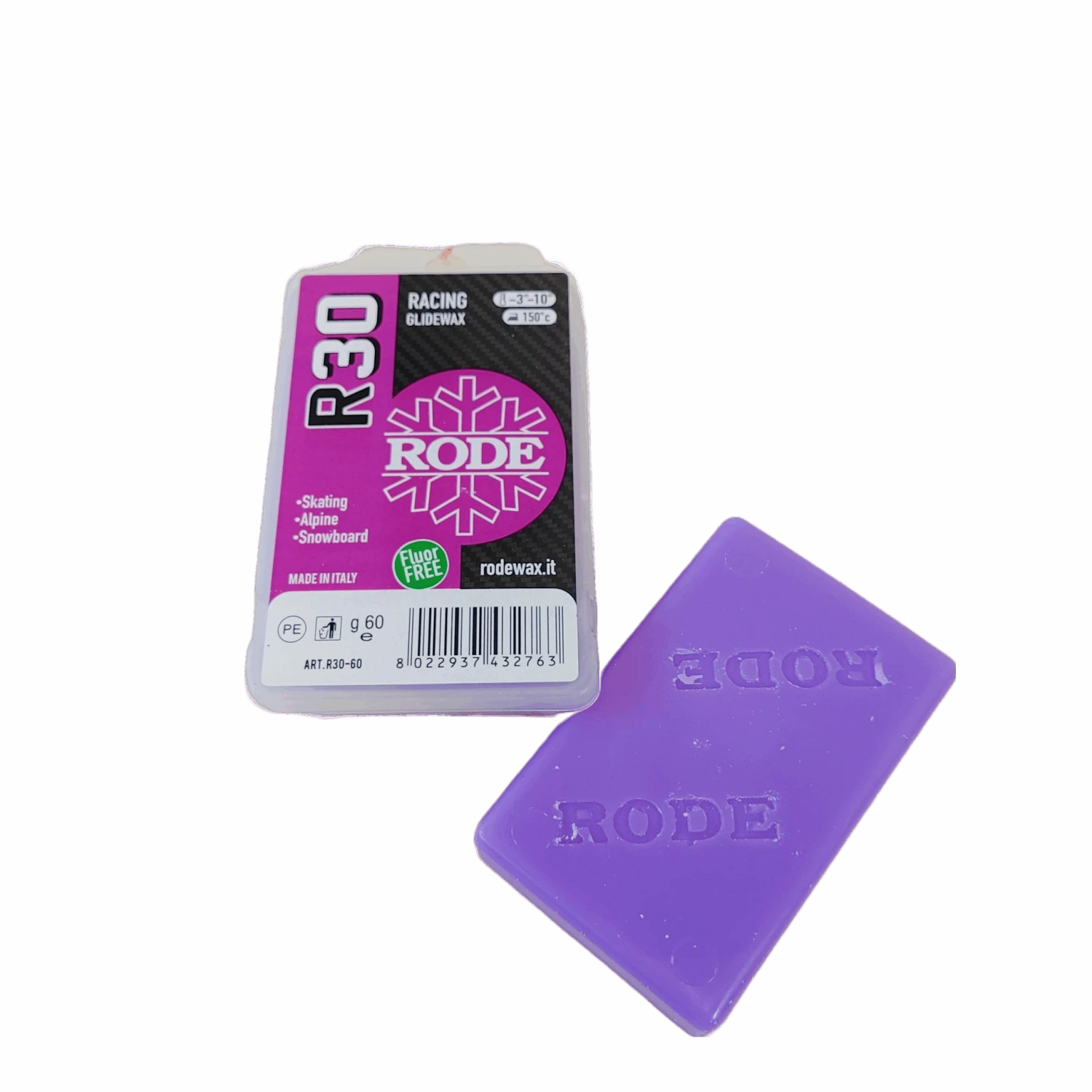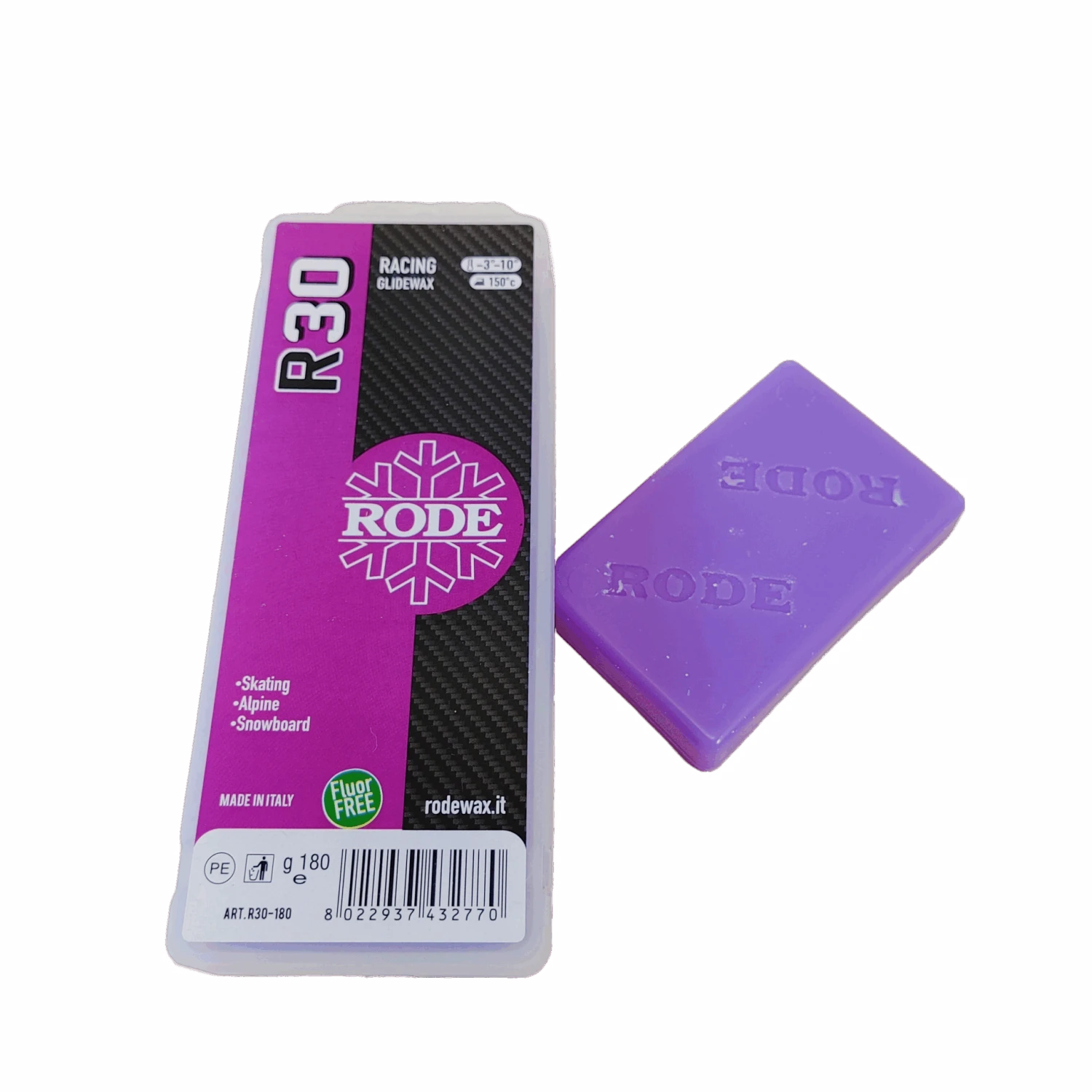 The R30 is great for mild, drier temperatures. Use by itself or as a base layer for other liquid or block top coats. Rode`s R-line glide waxes are made with eco-friendly fluoro-free additives. They are almost as fast as fluoro waxes even in high humidity! The `R` in R-line stands for `race` so these waxes are great for fluoro-free races. They`re also fantastic for training and everyday use.
