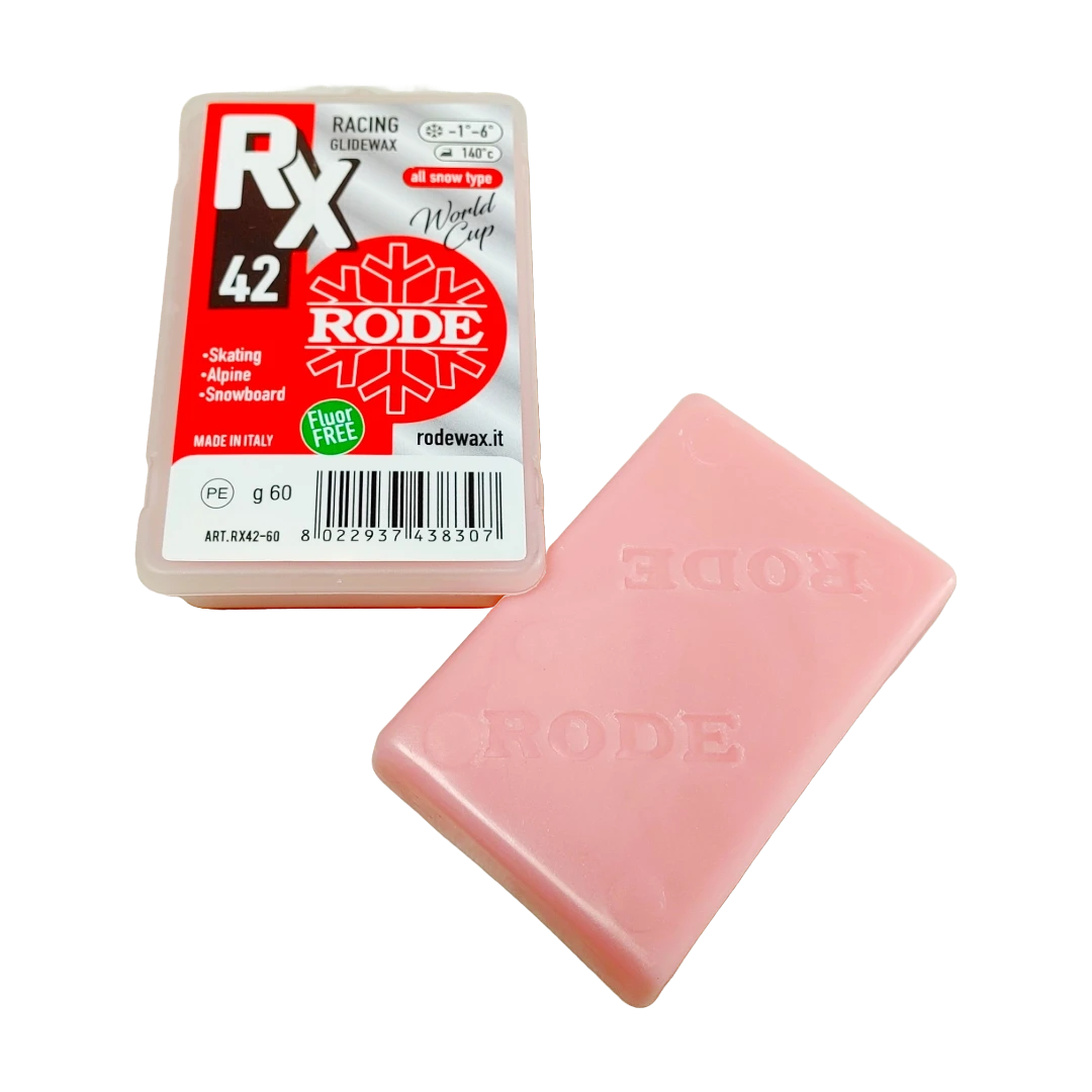 Rode`s new World Cup level melt wax! This paraffin line is was teased a few years back but Rode was not happy with the results. It was sent back to the lab, rigorously reworked, perfected, and now finally released! The RX42 is a warm to mild red paraffin. Used for any mild snow condition, old or new snow between -1C and -6C. Use by itself or as a base layer for other liquid or block top coats.