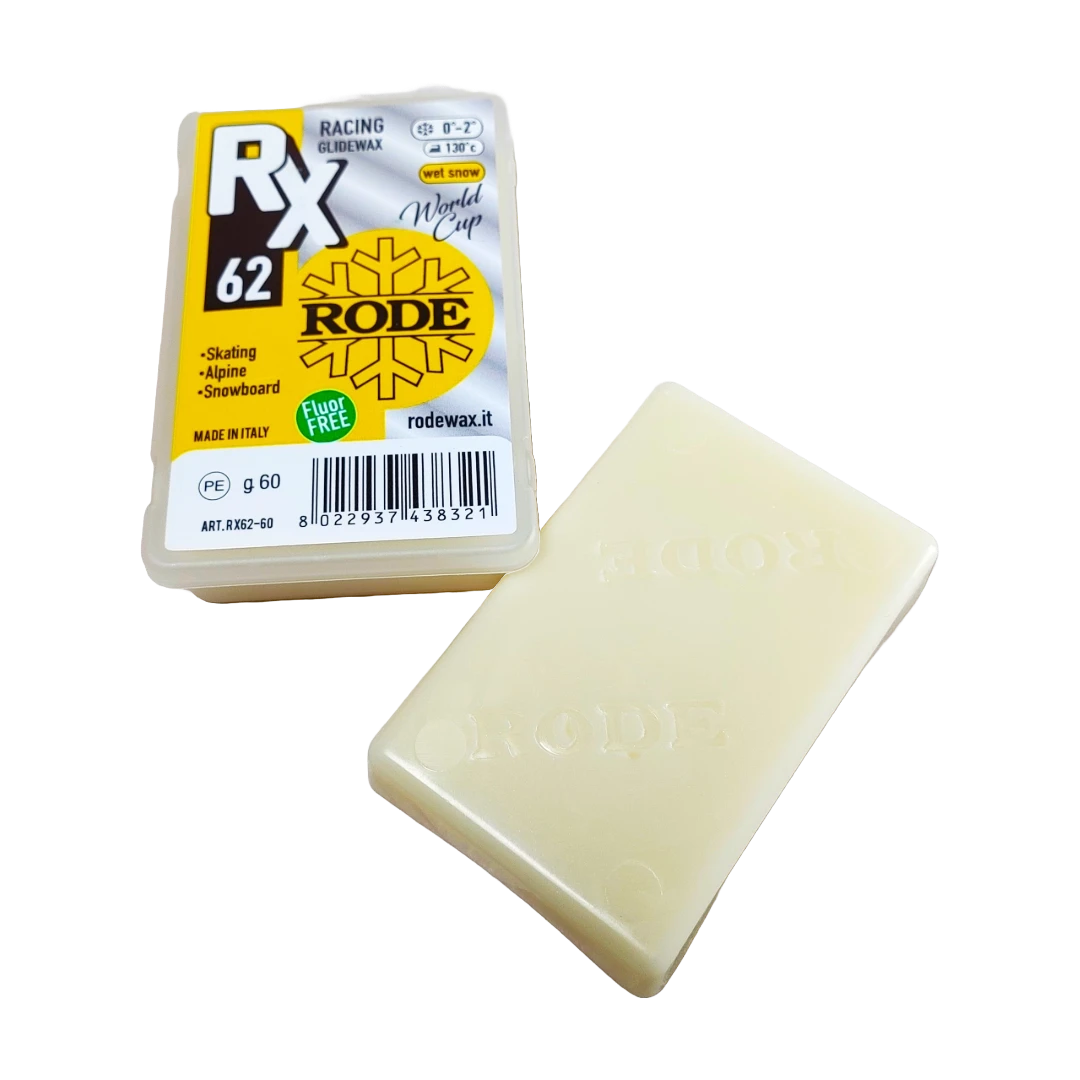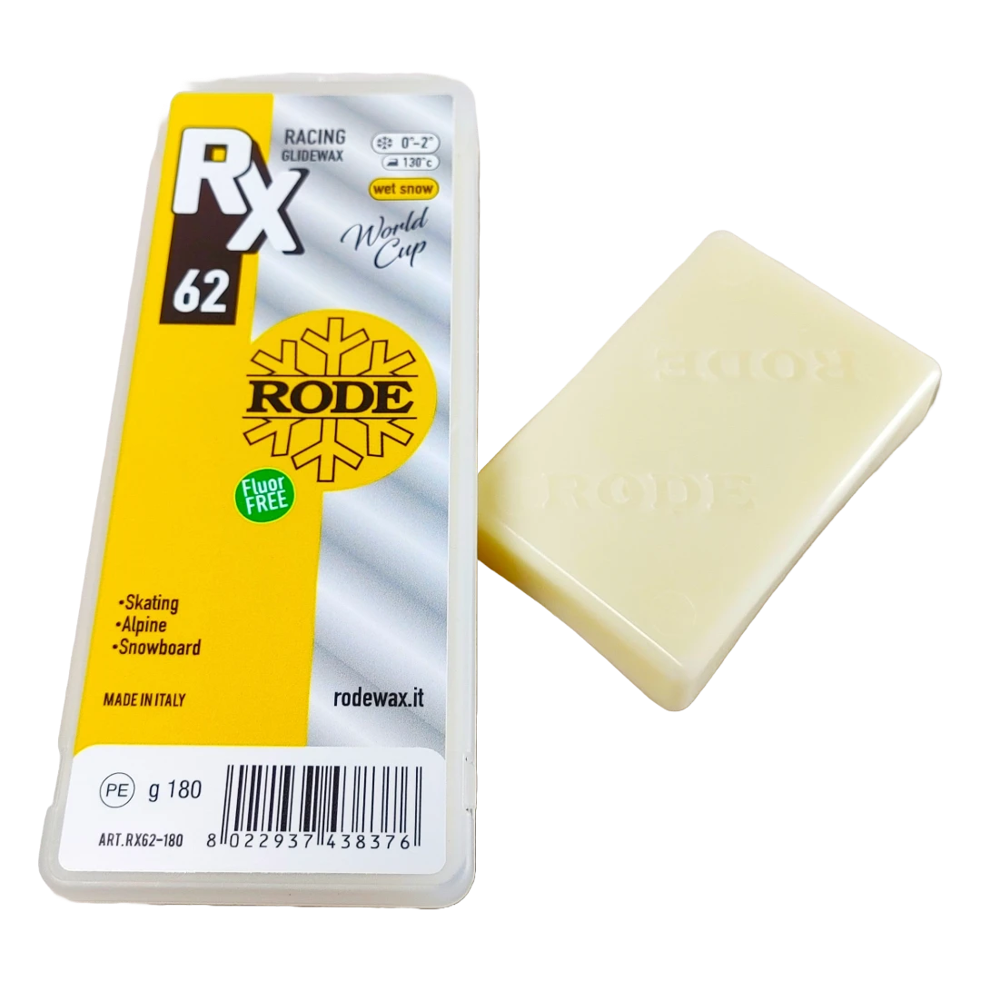 Rode`s new World Cup level melt wax! This paraffin line is was teased a few years back but Rode was not happy with the results. It was sent back to the lab, rigorously reworked, perfected, and now finally released! The RX62 is a warm weather yellow paraffin. Used for any warm, old snow conditions between 0C and -2C. Use by itself or as a base layer for other liquid or block top coats. For new snow conditions, use RX52.