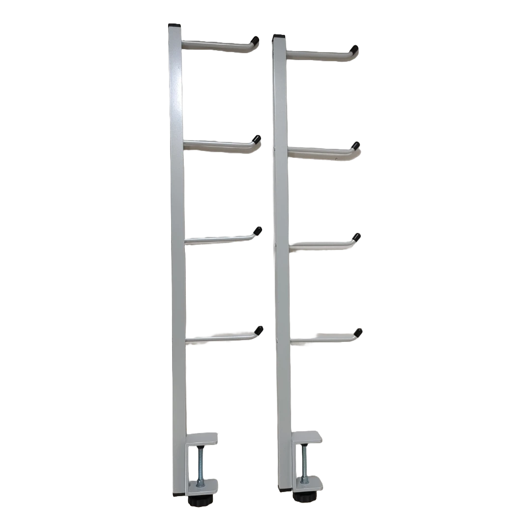 A ski rack that clamps to ski waxing tables. Holds 4 pairs of skis comfortably.