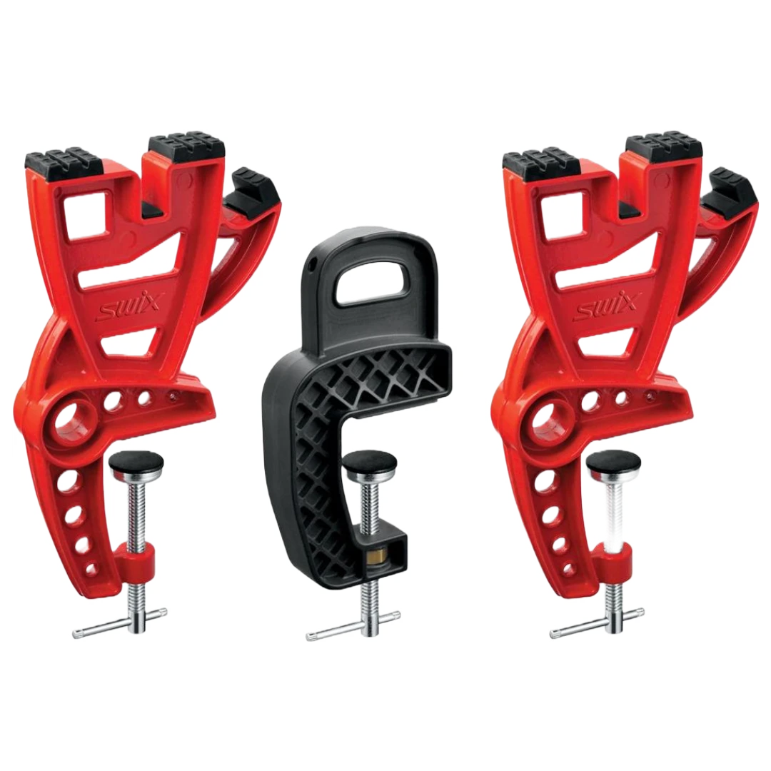 A newer variation of the Swix vise! This budget vise option uses a new center-piece for attaching using a `click system`. Designed for use with backcountry skis, alpine skis, or snowboards. This vise allows you to do edge work at 90° or 60°, or base work while the ski is flat.