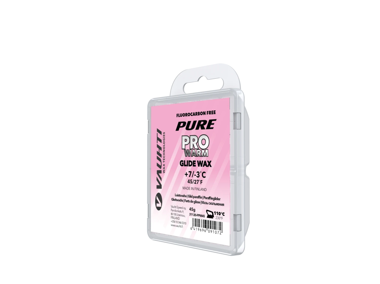 PURE PRO fluoro-free glide waxes are intended specifically for competitive skiers and demanding active skiers. High-quality hydrocarbon ingredients, zinc stearate and silicon wax gives excellence performance and good durability to the products in all weather conditions. Especially in natural snow. The PURE PRO WARM glide wax is one of Vauhti`s best base melt wax for wet, natural snow. It is usually used as a base under a liquid or block (wool applied) top coats.