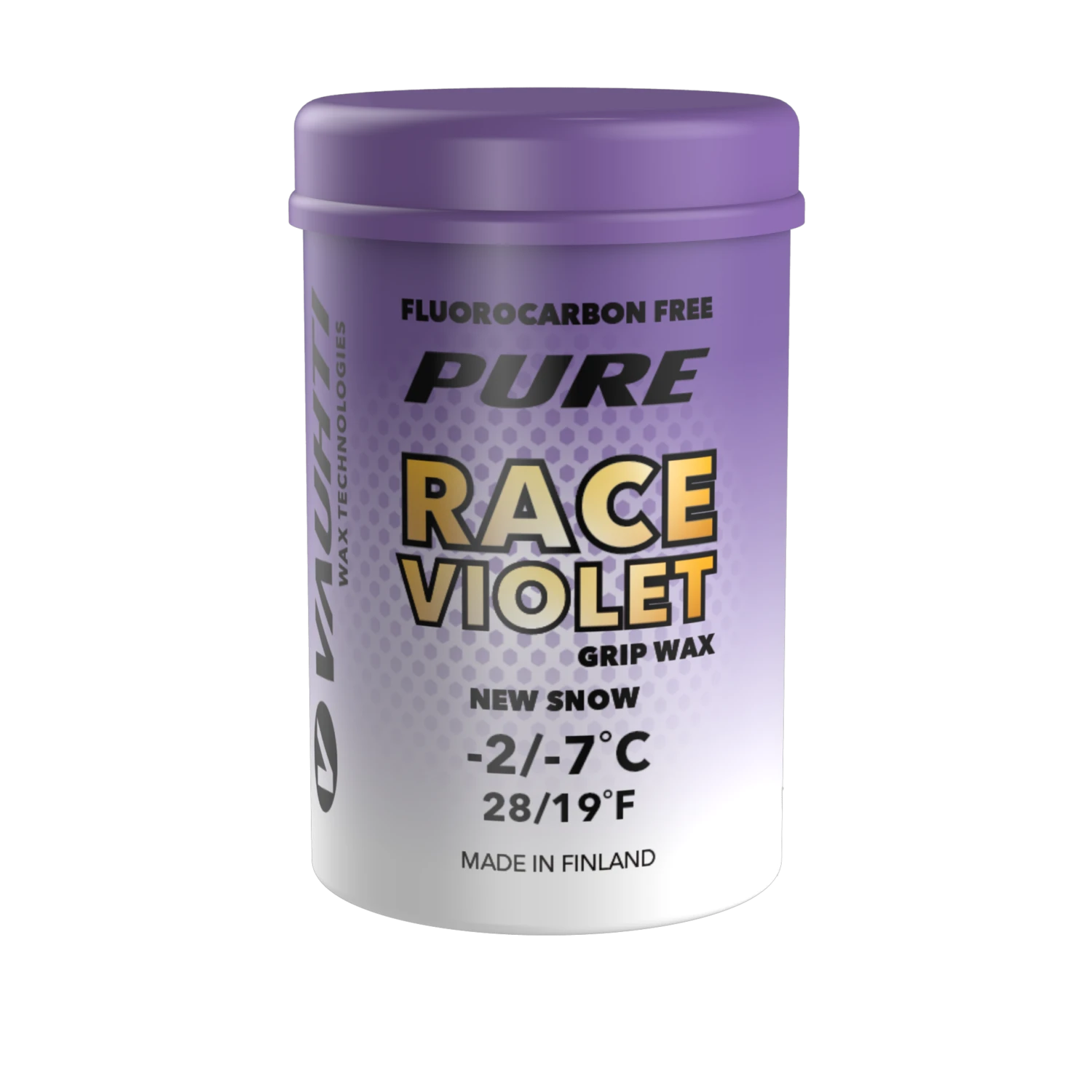 New fluoro-free racing kick wax from Vauhti. These PURE RACE synthetic kick waxes are made to work best in fine-grained or new snow. Race Violet is for shiny, fine grained, natural snow. For old, coarser snow, switch to Race LDR or Blue Klister, if the conditions allow. The PURE RACE waxes replace the old GF kick series.