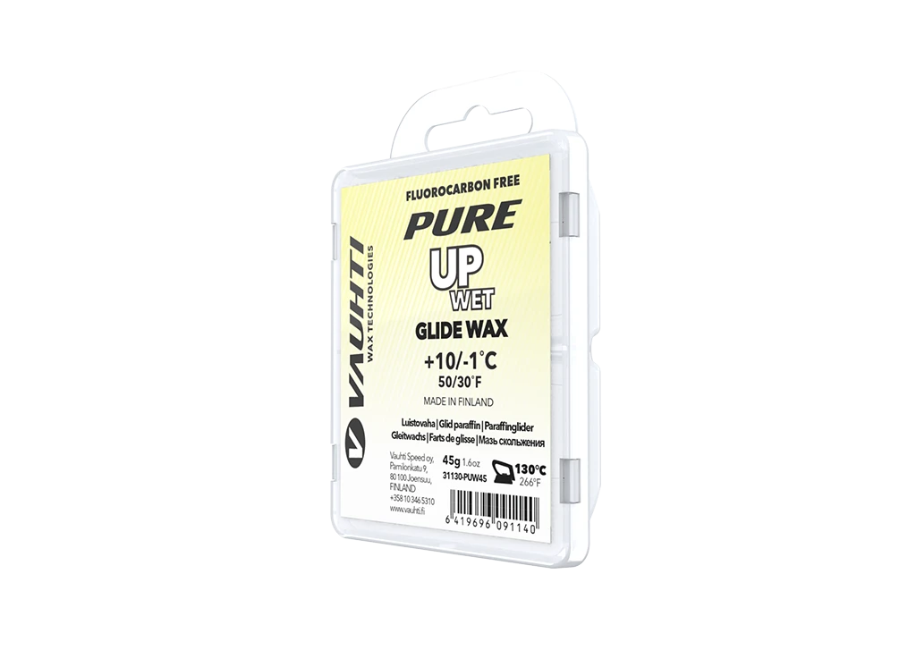 PURE UP fluoro-free glide waxes are intended active skiers and as a training wax for competitive skiers. High-quality hydrocarbon ingredients, zinc stearate and silicon wax gives excellence performance and good durability to the products in all snow types and weather conditions. UP WET paraffin is for saturated snow above 0C.
